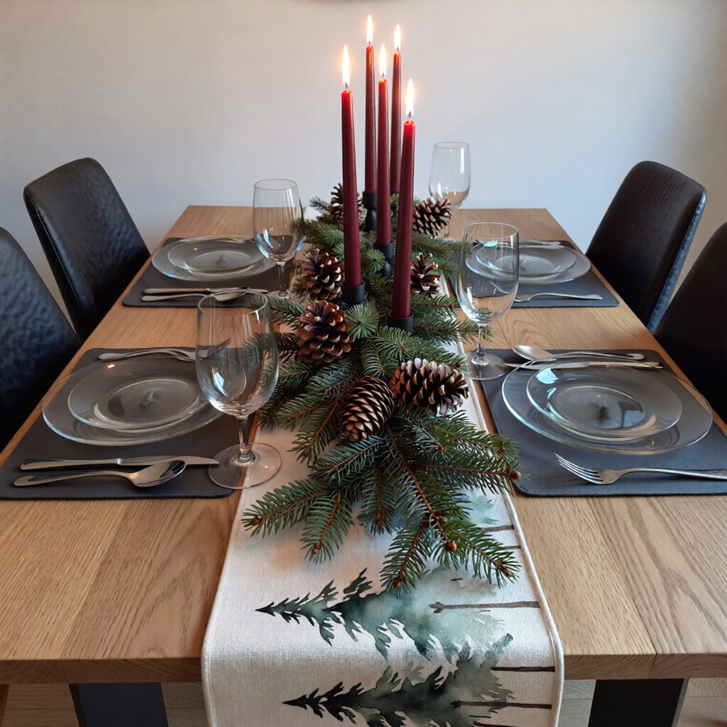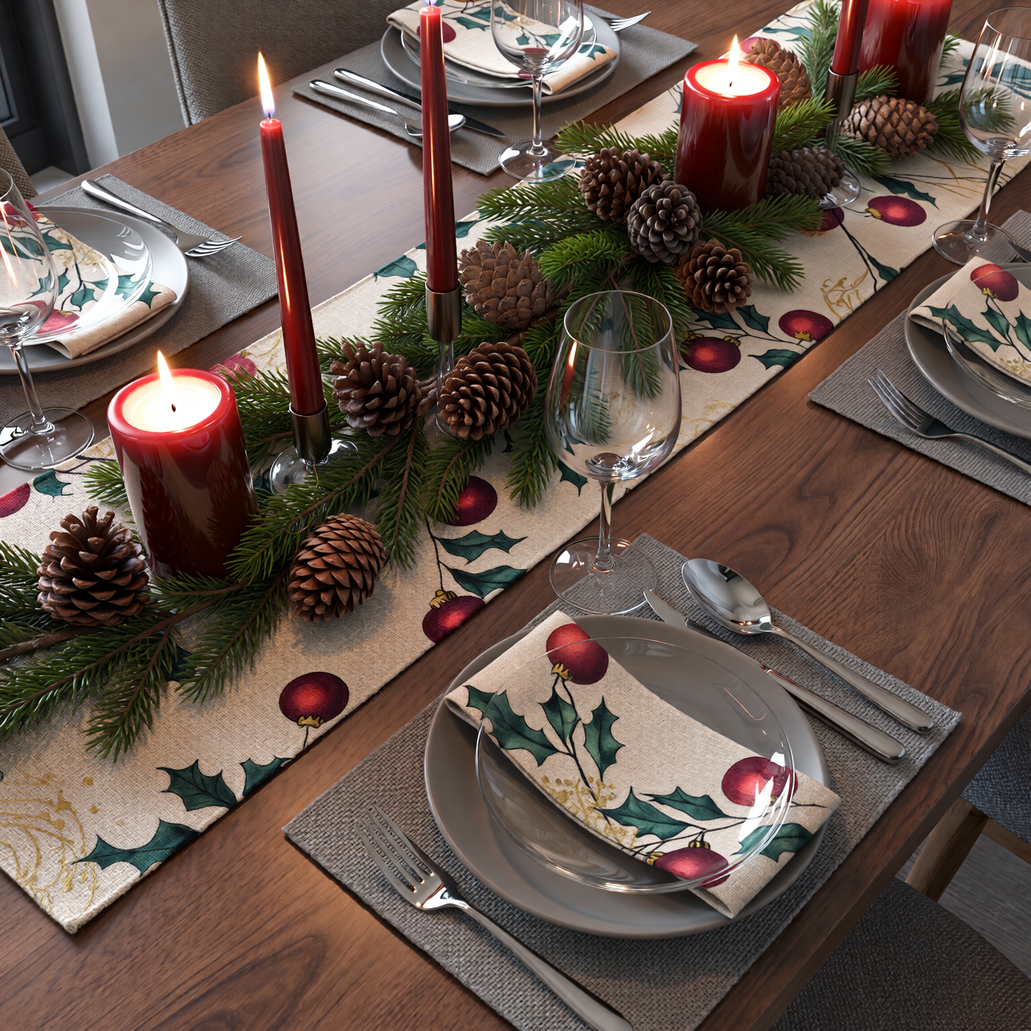 This 13×72 inch festive table runner features holly, pinecones, and seasonal motifs. Ideal for adding a pop of Christmas spirit to your kitchen or dining table for home parties or holiday gatherings.